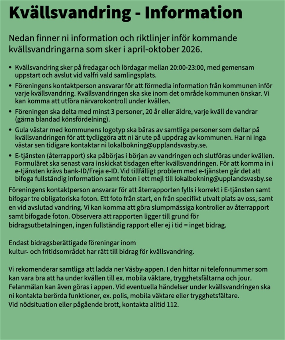 Alla föräldrar i laget har blivit tilldelade ett datum att kvällsvandra på. En representant från varje familj förväntas medverka. Det går också att byta pass mellan grupperna, det kan ni göra direkt med varandra utan att ni behöver ta kontakt med oss ledare.